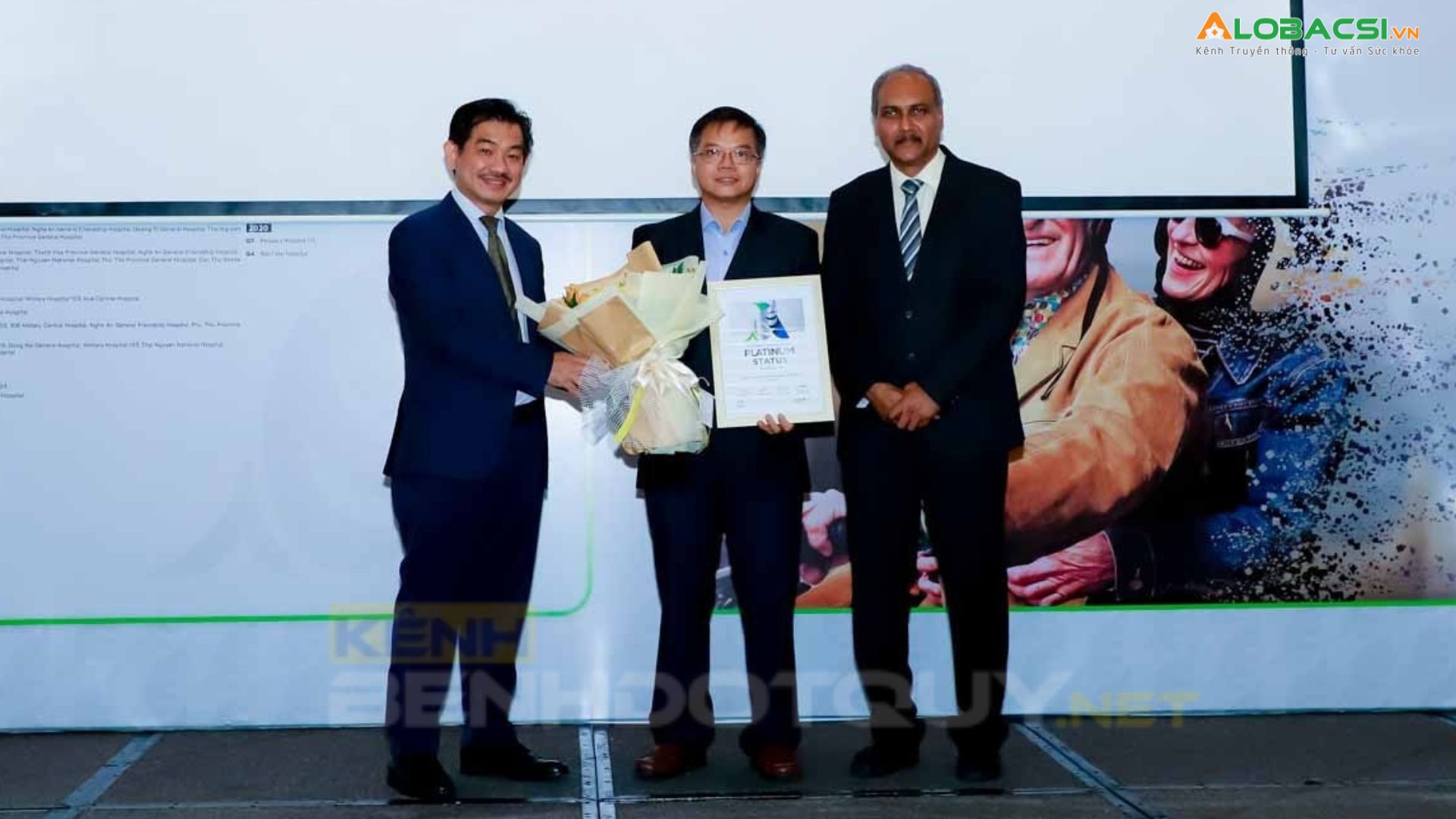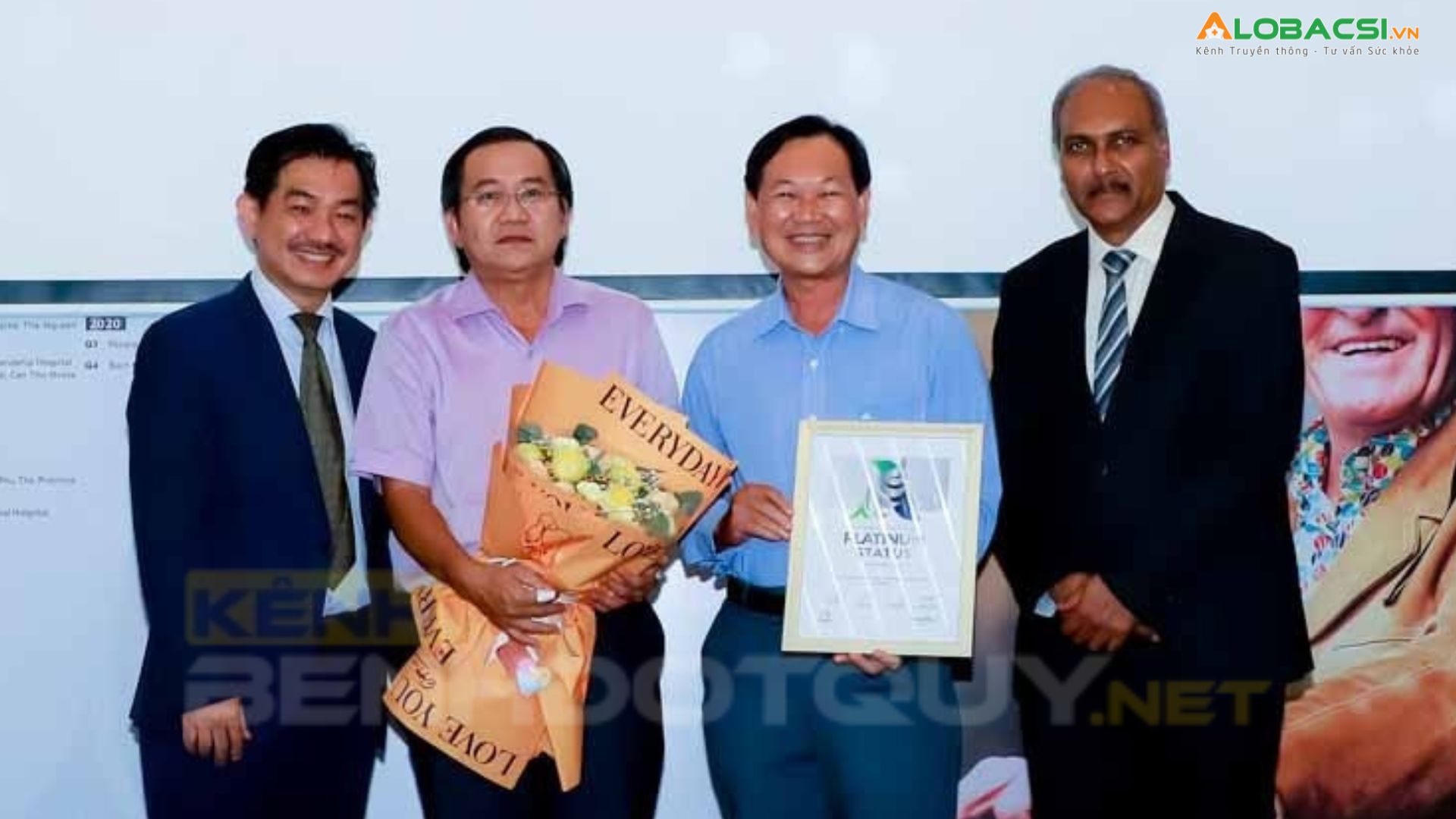 Bệnh viện đa khoa Trung tâm An Giang nhận giải thưởng từ Chủ tịch Hội Đột quỵ thế giới (ngoài cùng bên phải) và Phó Chủ tịch Hội Đột quỵ Việt Nam (ngoài cùng bên trái)