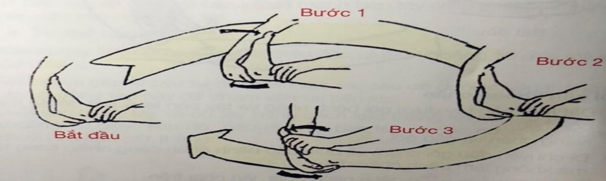 Bắt đầu với cánh tay bệnh nhân dang ra ngoài, thẳng góc 90 độ so với cơ thể, gập khuỷu tay 90 độ, để tay chỉ lên trần nhà còn khuỷu tay vẫn nằm tựa trên giường. Nhẹ nhàng đưa cẳng tay xuống hướng về phía chân, sau đó hướng về phía đầu.