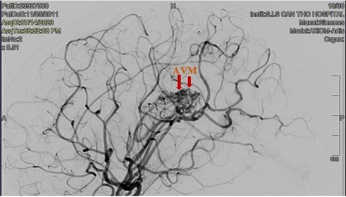 Khi vào Bệnh viện Đa khoa Quốc tế S.I.S Cần Thơ, bệnh nhi bị đau đầu nhiều và yếu nửa người trái. Theo BS. CKII Ngô Minh Tuấn – Trưởng khoa CĐHA – TDCN, Bệnh viện S.I.S Cần Thơ, bé A. vào viện đã bị xuất huyết não do vỡ dị dạng thông động tĩnh mạch não (AVM) và có túi giả phình lớn (kích thước 3x3mm) trong búi dị dạng, tình trạng rất nguy hiểm. Bệnh nhi đã được ê-kip can thiệp thành công, giảm lưu lượng của dị dạng và đặc biệt là tắc được túi giả phình cho bé.
