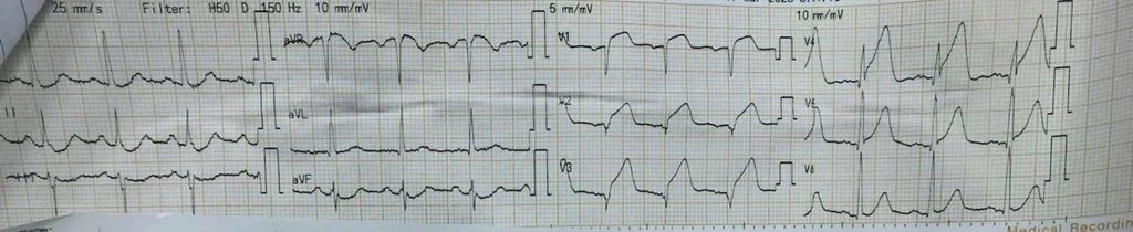 Nam bệnh nhân 50 tuổi, nhập viện với triệu chứng đau ngực dữ dội kèm khó thở. Tại khoa Cấp cứu, Bệnh viện nhân dân 115, điện tâm đồ cho thấy dấu hiệu nhồi máu cơ tim cấp ST chênh lên vùng trước rộng – một tình trạng cấp cứu tim mạch nguy hiểm.