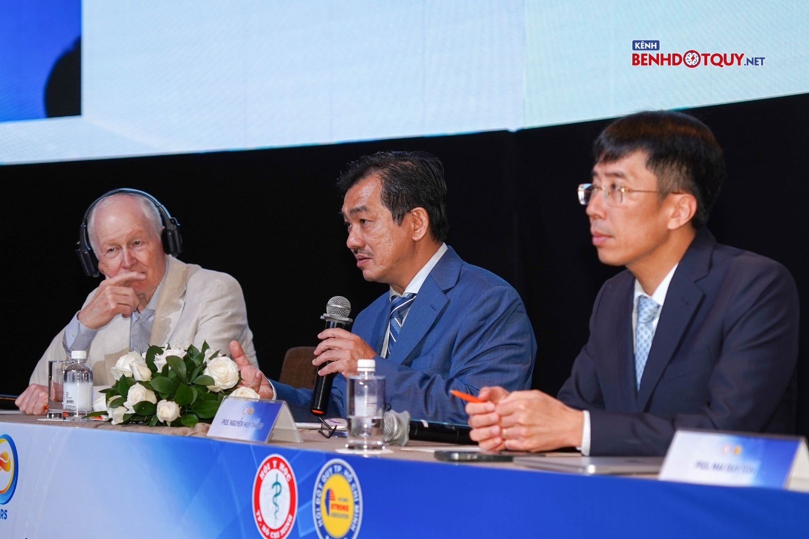 Các chuyên gia chủ tọa phiên báo cáo tại Hội nghị Đột quỵ TPHCM 2025, từ trái sang: GS Geoffrey Donnan, PGS.TS.BS Nguyễn Huy Thắng và PGS.TS.BS Mai Duy Tôn.