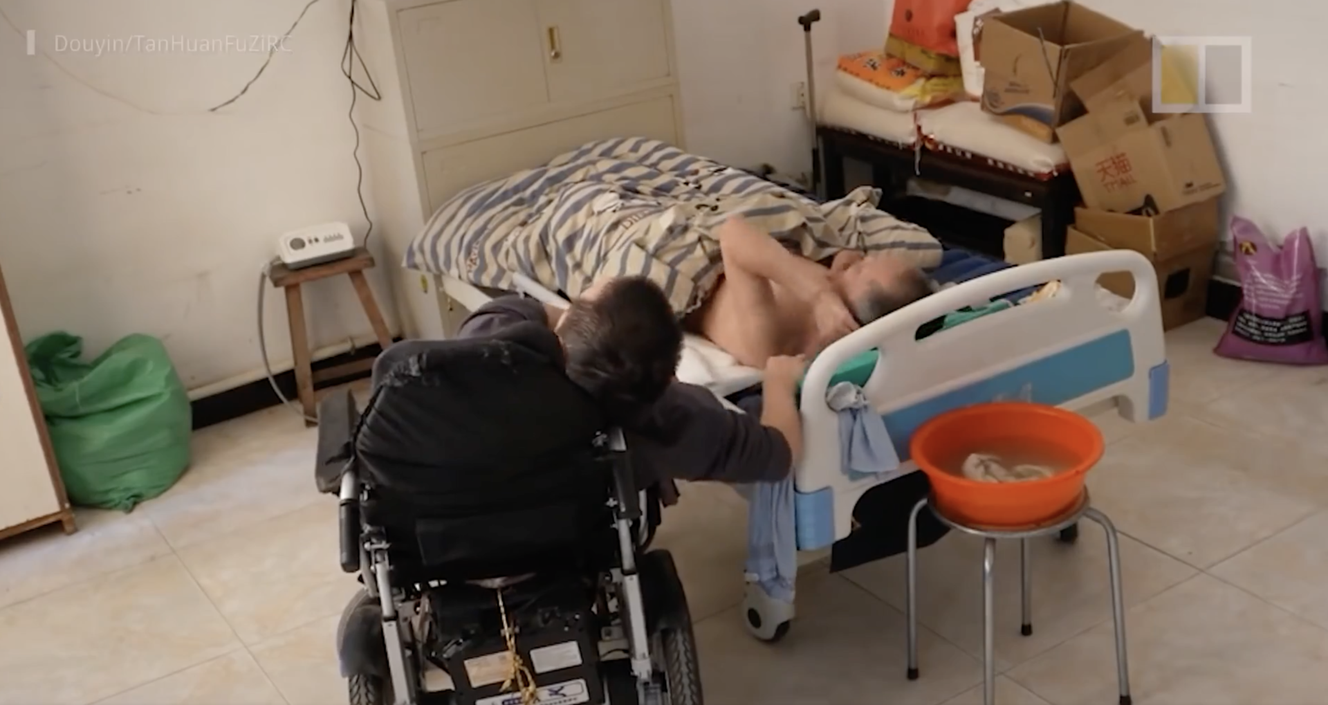 Anh Trương Hiểu Đông (sinh năm 1984), ở tỉnh Hắc Long Giang, đông bắc Trung Quốc, đang chăm sóc người cha già 62 tuổi nằm bất động trên giường sau cơn đột quỵ “tử thần”. Câu chuyện không có gì đáng nói nếu như anh Trương là một người khỏe mạnh bình thường. Không may, anh Đông bị mắc bệnh viêm cột sống dính khớp vào năm 2008, cơ thể căng cứng và chỉ có thể cử động hai tay.