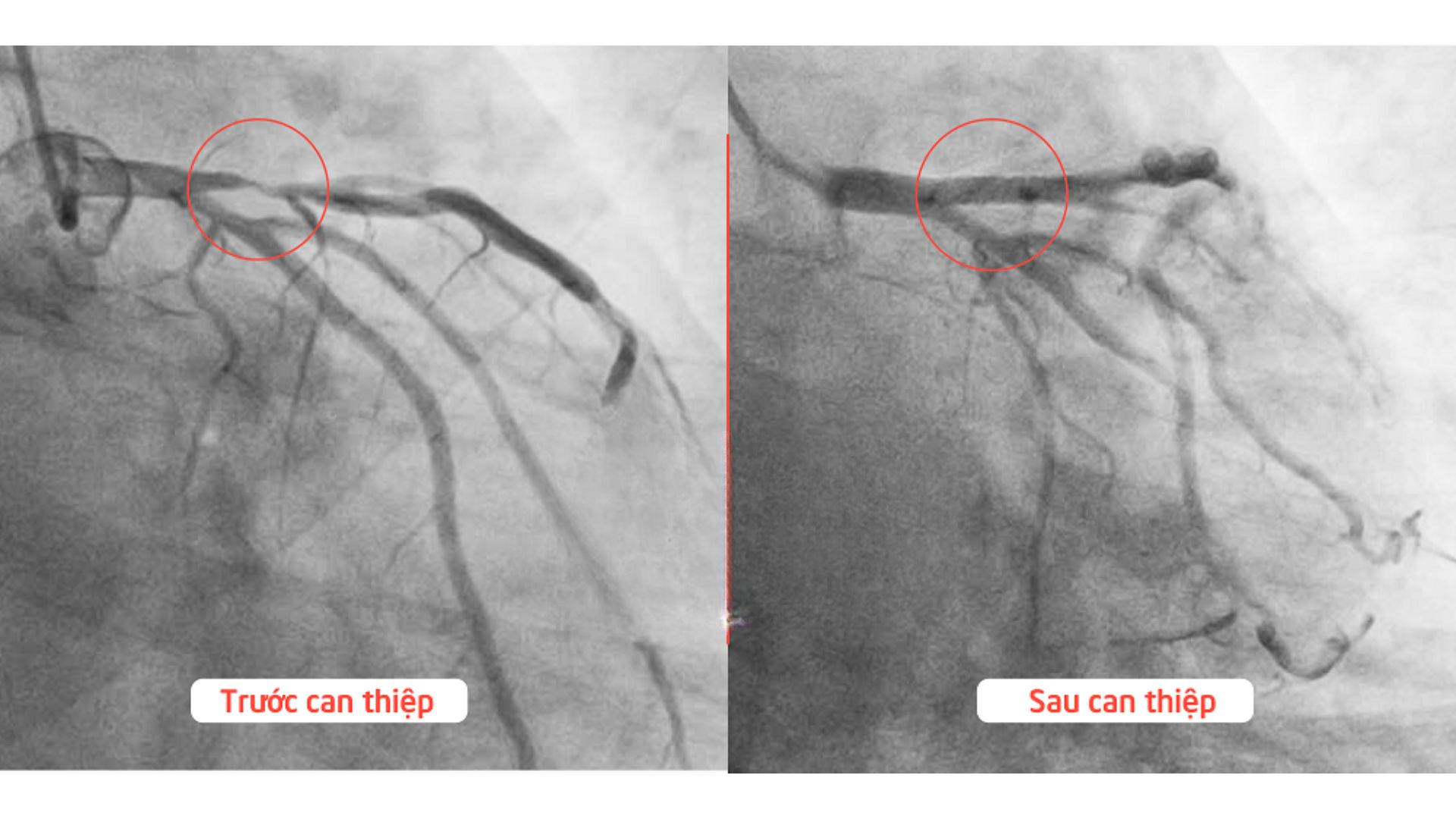 Kết quả cho thấy động mạch liên thất trước bị hẹp nặng, lên đến 95% (đây là 1 nhánh mạch máu rất lớn và quan trọng của tim) nguy cơ tử vong cao. Ekip bác sĩ khoa Tim mạch – Nội tiết đã nhanh chóng tiến hành can thiệp bằng cách nong bóng và đặt stent để khôi phục dòng máu, phủ toàn bộ tổn thương.
