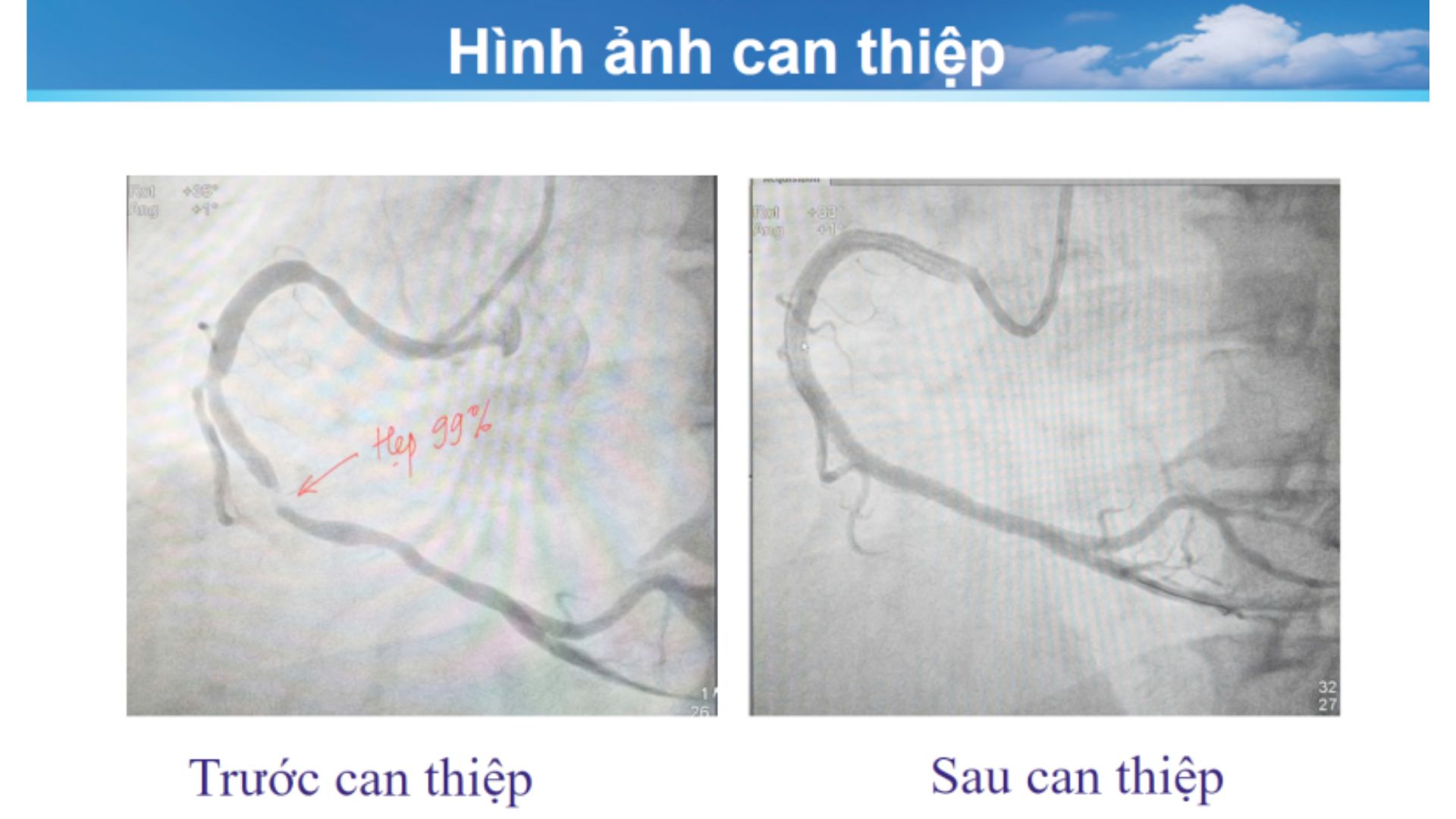 Bệnh nhân được xử trí theo phác đồ cấp cứu hội chứng vành cấp và chỉ định chụp động mạch vành qua da khẩn cấp. Kết quả cho thấy: động mạch vành phải (RCA) đoạn 2-3 hẹp tới 99%, đoạn 1 hẹp 60% – nguy cơ hoại tử cơ tim lan rộng và đe dọa tính mạng nếu không tái thông kịp thời.