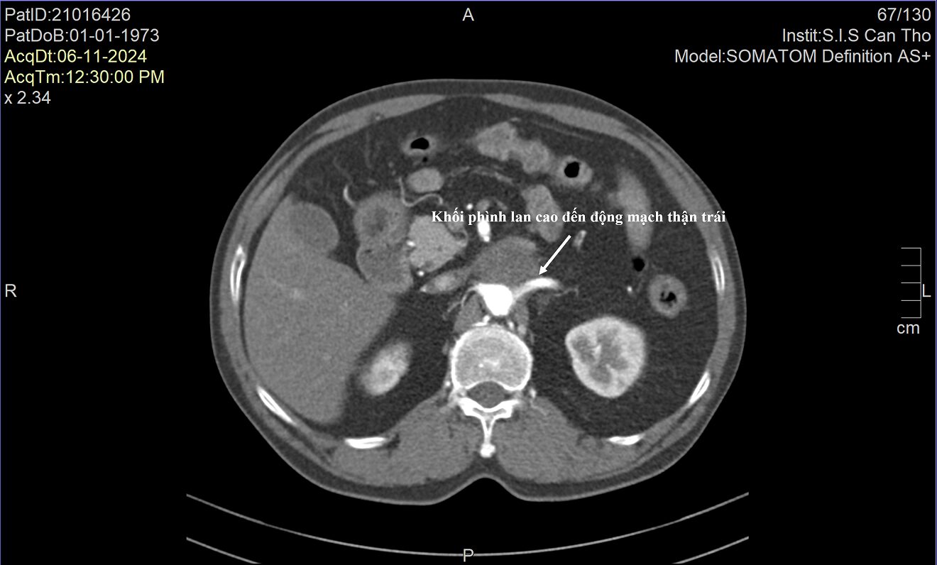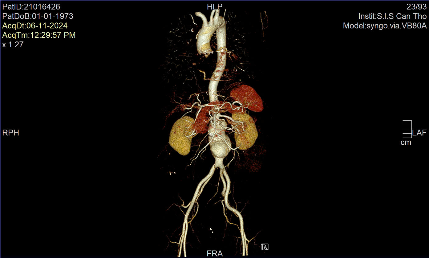 Tuy nhiên, khi đến Bệnh viện Đa khoa Quốc tế S.I.S Cần Thơ, qua thăm khám và chụp CT các bác sĩ xác nhận đây là trường hợp phình động mạch chủ bụng dưới thận với kích thước khoảng 9cm.