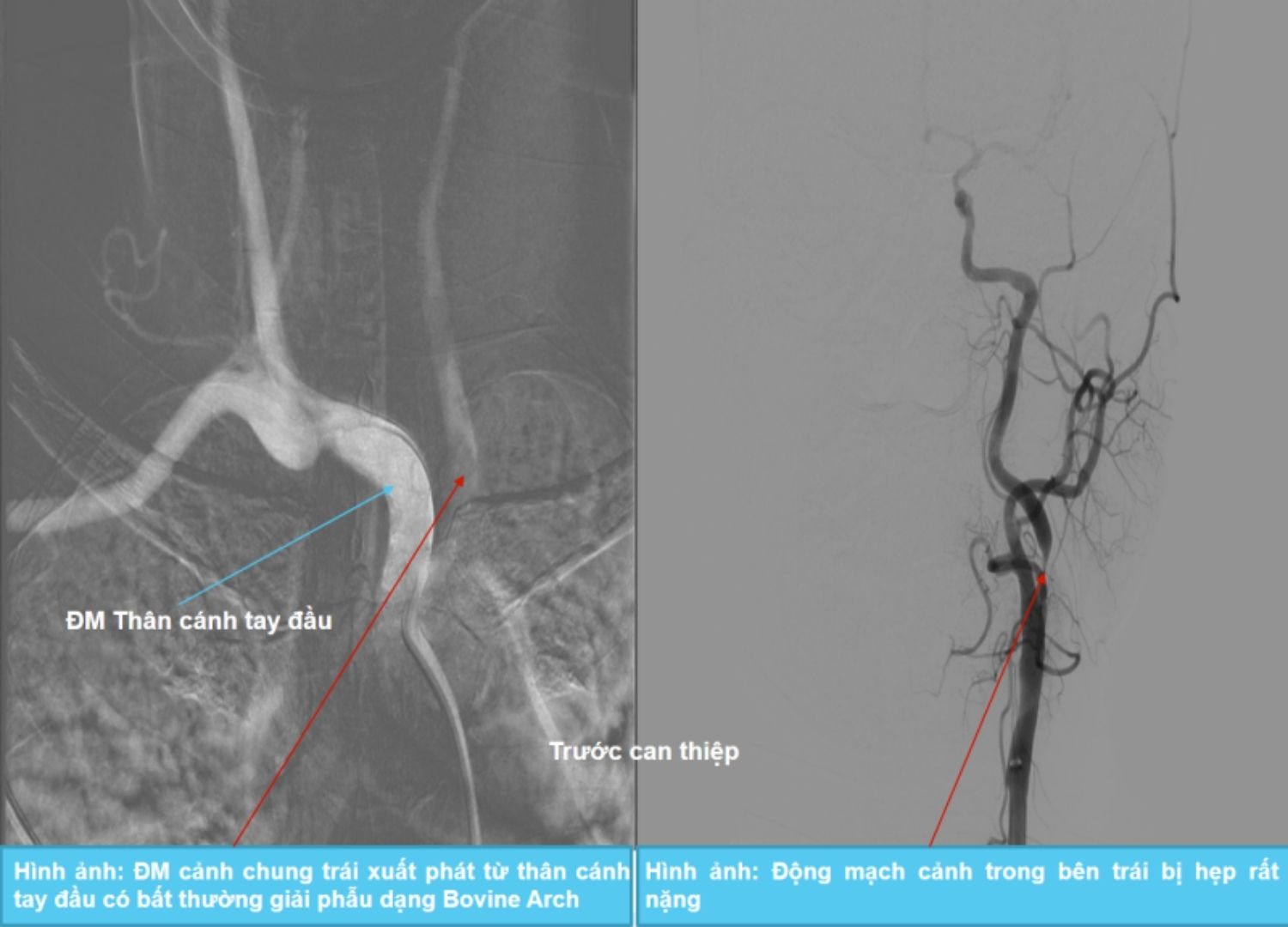 Đặc biệt, bệnh nhân có bất thường giải phẫu dạng Bovine Arch – khi động mạch cảnh chung trái không xuất phát từ cung động mạch chủ như thông thường, mà từ thân động mạch cánh tay đầu. Đây là một bất thường chỉ gặp ở khoảng 15% dân số và làm thay đổi hướng đi của ống thông trong kỹ thuật can thiệp, gây khó khăn cho bác sĩ.
