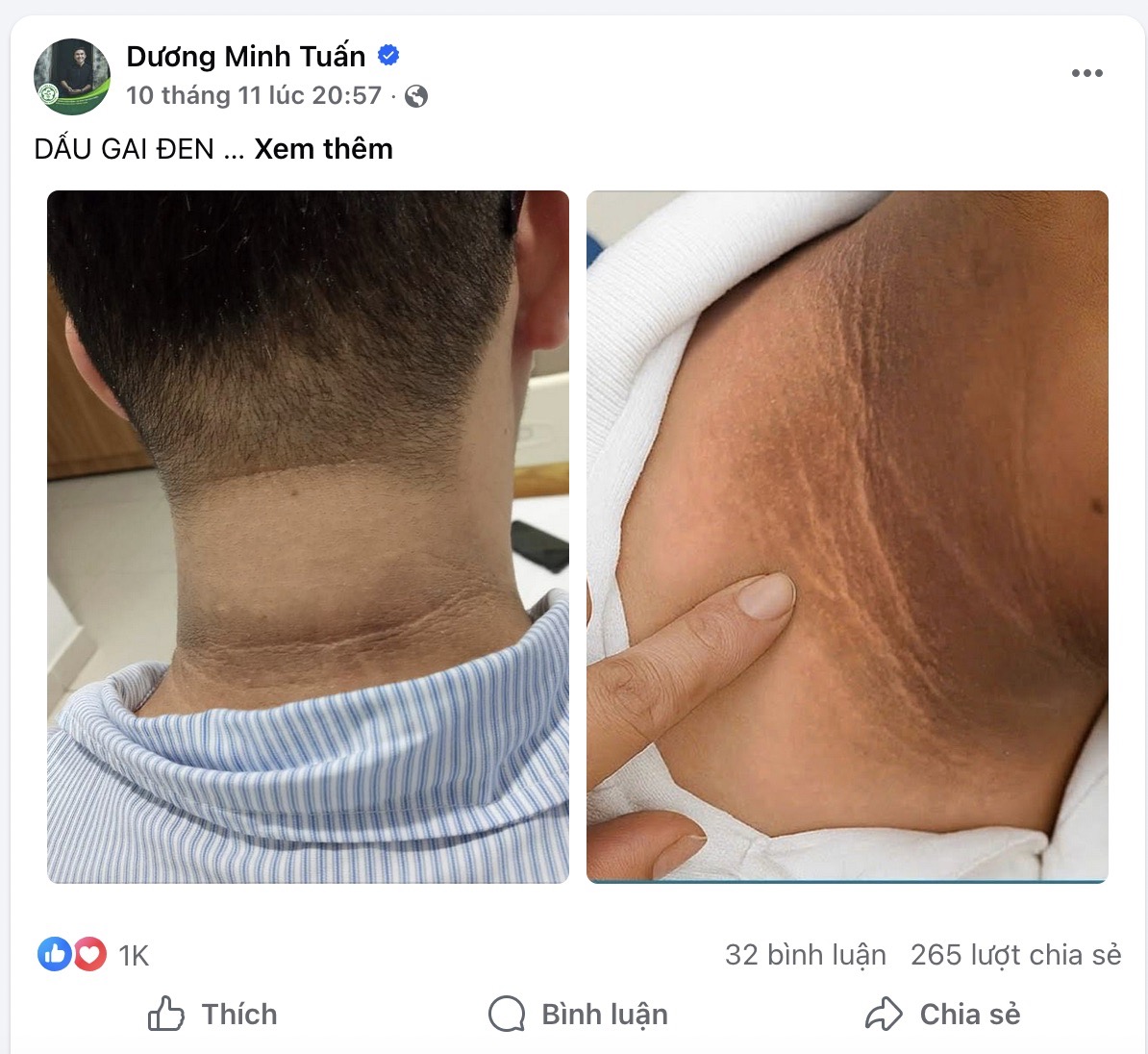 BS.CK2 Dương Minh Tuấn nhấn mạnh, dấu gai đen là một biomarker lâm sàng phản ánh mức độ đề kháng insulin, cho phép nhận diện sớm giai đoạn tiền đái tháo đường và các rối loạn chuyển hoá tiềm ẩn. Sự thoái triển của dấu gai đen theo thời gian là minh chứng cho hiệu quả của can thiệp chuyển hoá chứ không phải kết quả của điều trị thẩm mỹ đơn thuần.