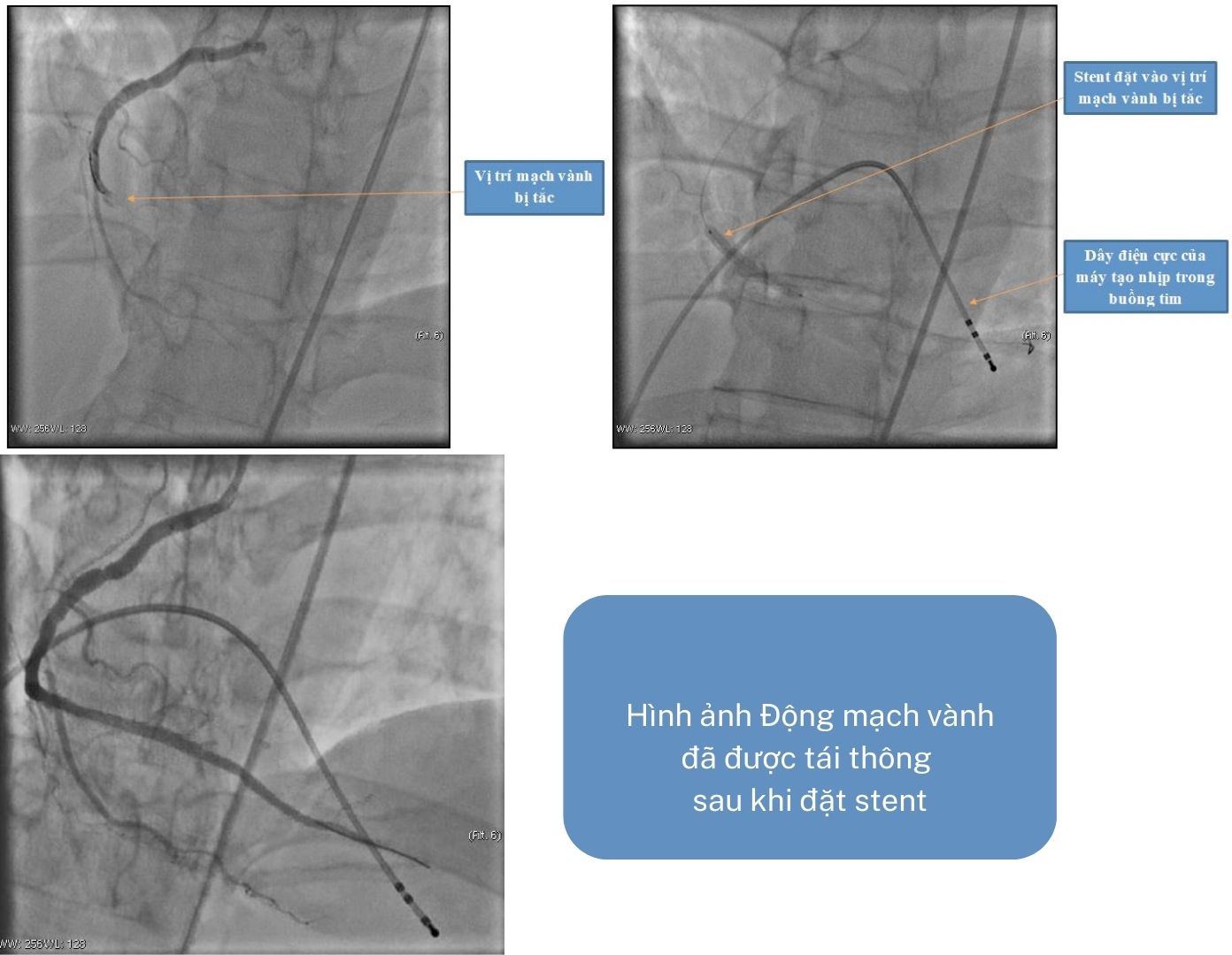Việc khôi phục nhịp tim mới chỉ là bước khởi đầu, bởi nguyên nhân gây ngừng tim vẫn chưa được giải quyết. Bệnh nhân lập tức được đưa vào phòng can thiệp tim mạch để chụp và xử trí tổn thương. Hình ảnh cho thấy động mạch vành phải bị tắc hoàn toàn. Ekip tiến hành đặt máy tạo nhịp và stent tái thông vị trí tắc, khôi phục lưu lượng máu nuôi tim.