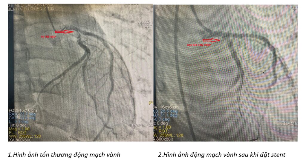 Hình ảnh chụp động mạch vành trước và sau đặt stent (Ảnh: BV Quân y 103)