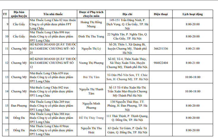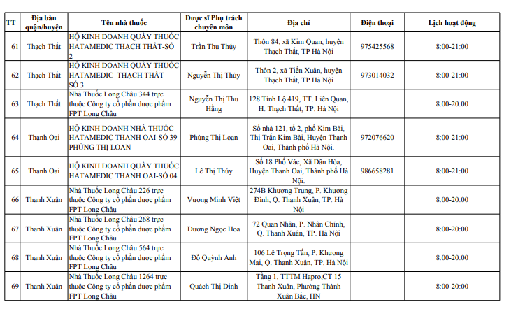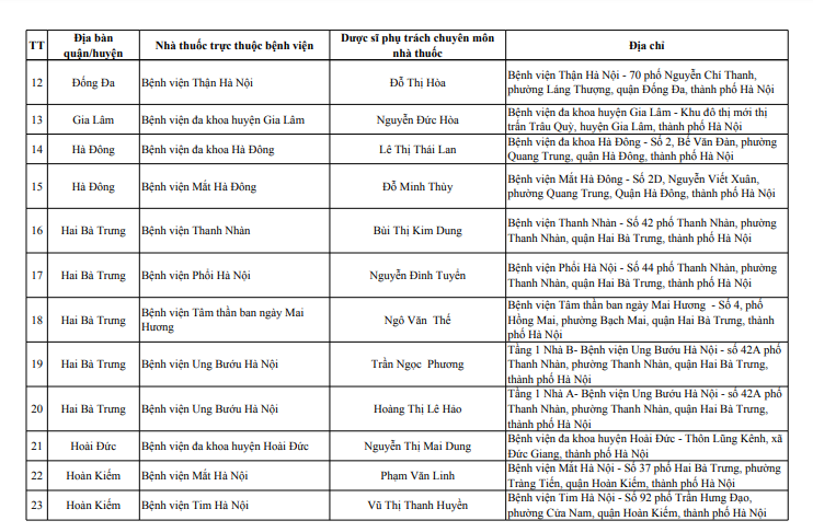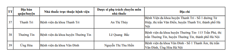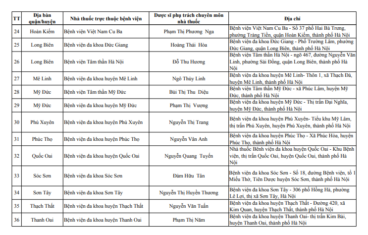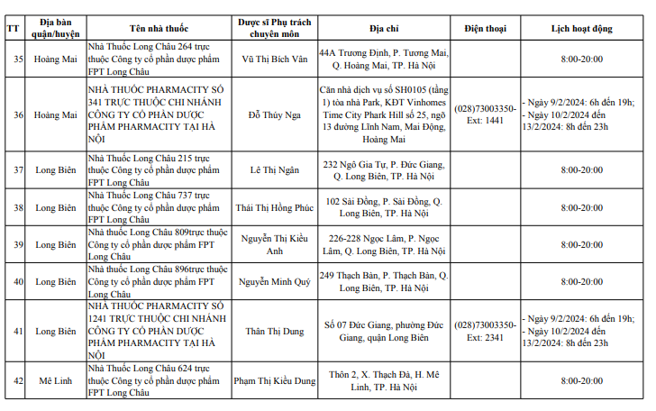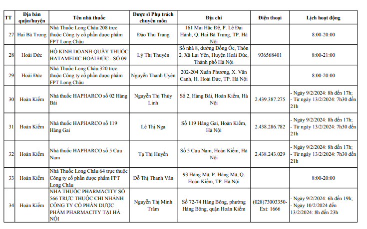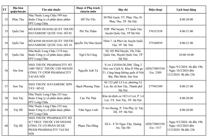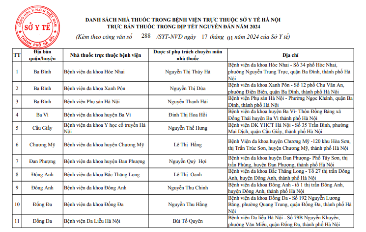 Sở Y tế Hà Nội vừa công bố danh sách 114 điểm trực bán lẻ thuốc, gồm 39 điểm trực bán thuốc là các nhà thuốc trong bệnh viện trực thuộc Sở Y tế Hà Nội và 75 quầy thuốc/ nhà thuốc tư nhân tại 30 quận, huyện, thị xã, phục vụ người dân trên địa bàn thành phố dịp Tết Nguyên đán Giáp Thìn 2024.