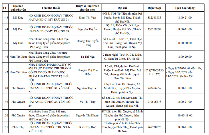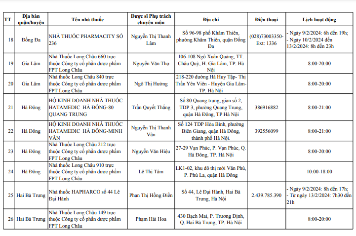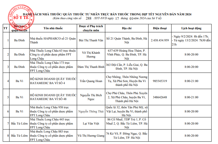 Hà Nội công bố danh sách 114 cơ sở bán lẻ thuốc, trực bán thuốc trong dịp tết Nguyên đán Giáp Thìn 2024