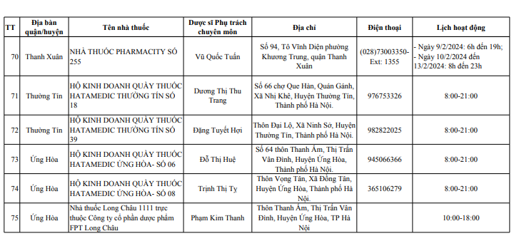 Sở Y tế Hà Nội vừa công bố danh sách 114 điểm trực bán lẻ thuốc, gồm 39 điểm trực bán thuốc là các nhà thuốc trong bệnh viện trực thuộc Sở Y tế Hà Nội và 75 quầy thuốc/ nhà thuốc tư nhân tại 30 quận, huyện, thị xã, phục vụ người dân trên địa bàn thành phố dịp Tết Nguyên đán Giáp Thìn 2024.