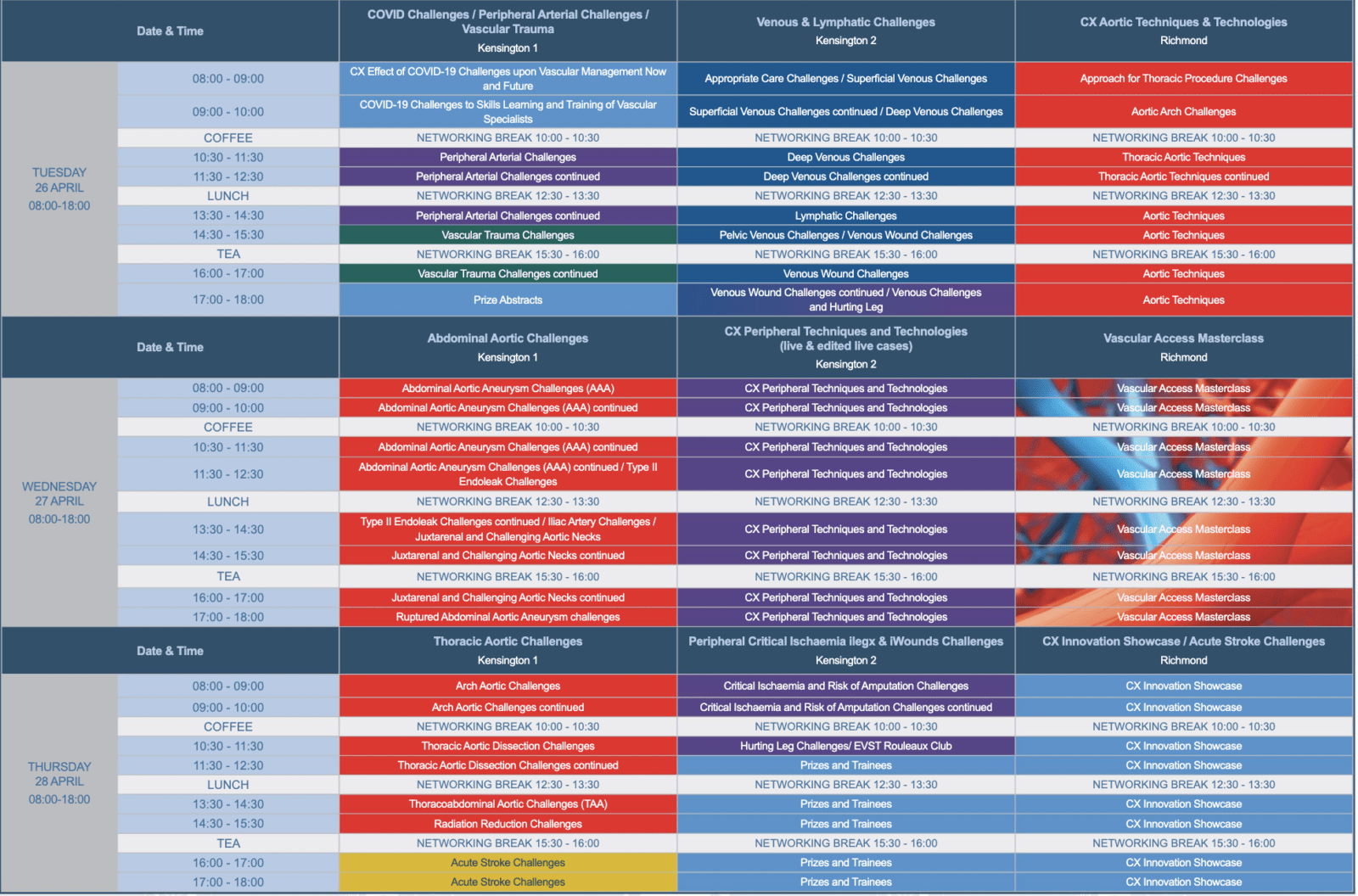 Năm nay, đội ngũ giảng viên đẳng cấp thế giới tập trung vào giải quyết những thách thức cấp bách nhất ảnh hưởng đến tất cả các khía cạnh của quản lý bệnh mạch máu trên các lĩnh vực cốt lõi của Hội nghị chuyên đề của chúng tôi: Động mạch chủ, Ngoại vi, Tĩnh mạch, Đột quỵ cấp, Tiếp cận Mạch máu và chủ đề mới, Chân đau.