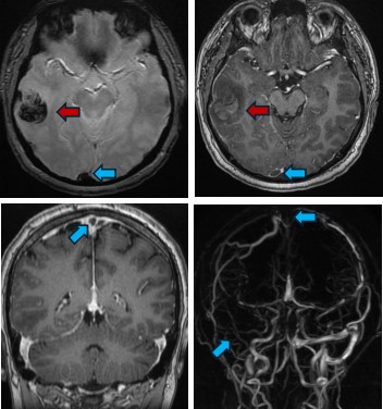 Hình ảnh MRI sọ não của bệnh nhân: Xuất huyết não vùng thái dương phải (nũi tên đỏ); Huyết khối xoang tĩnh mạch dọc trên, xoang ngang – xoang sigma, tĩnh mạch vỏ não đính 2 bên (mũi tên xanh)