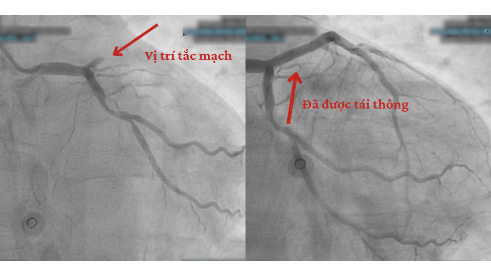 Ngay sau khi ổn định các chỉ số sinh tồn, bệnh nhân được đưa vào phòng Can thiệp Tim mạch. Qua hình ảnh chụp mạch vành, các bác sĩ phát hiện tắc hoàn toàn ngay sau lỗ động mạch liên thất trước (mạch máu chính nuôi tim).