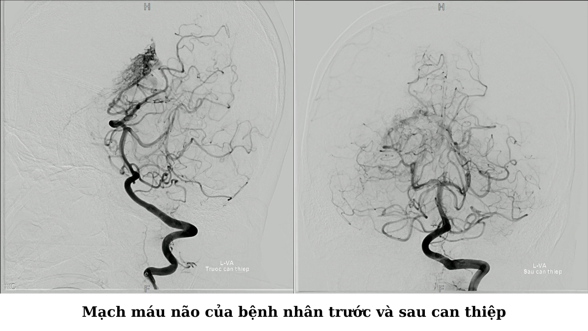 Điều đáng nói là búi dị dạng nằm rất sâu, khó phẫu thuật triệt để ngay. Tuy nhiên, nhờ can thiệp mạch cầm máu chính xác trước khi mổ, bác sĩ có thể thực hiện phẫu thuật với đường mổ nhỏ, không cần gửi nắp sọ đi nuôi, giúp giảm nguy cơ nhiễm trùng và rút ngắn thời gian hồi phục.