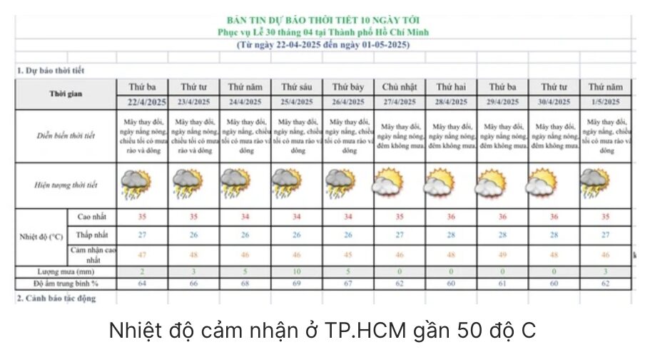 Theo Đài Khí tượng thủy văn khu vực Nam bộ, trong 10 ngày tới, TPHCM và các tỉnh Nam bộ sẽ trải qua hai đợt nắng nóng kéo dài: đợt đầu đến ngày 23/4 và đợt tiếp theo từ 27/4 – 1/5.