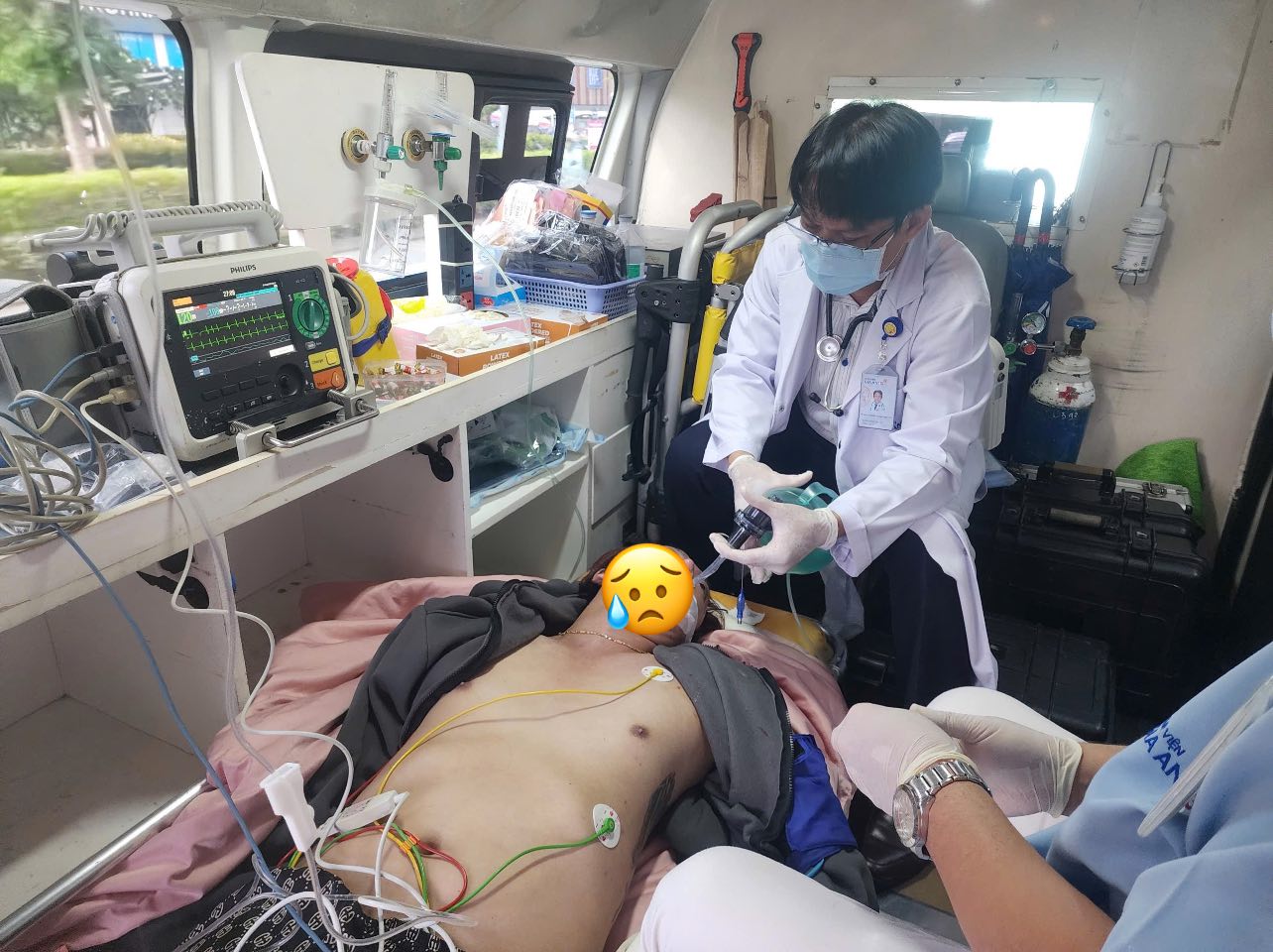 Ngay lập tức, ekip đặt nội khí quản, bóp bóng giúp thở, sử dụng thuốc cấp cứu. Khi đang chuyển từ lầu 1 xuống để lên xe, bệnh nhân ngưng tim. Rất may, sau vài phút hồi sức tích cực gồm ép tim, sốc điện, dùng thuốc, tim đã đập trở lại.