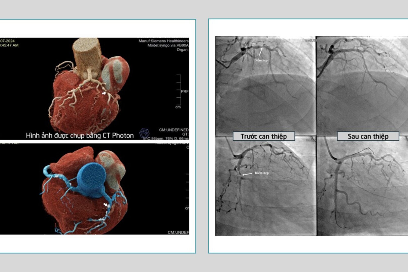 Sau khoảng 60 phút can thiệp, ê-kíp đã đặt thành công 2 stent ở 2 vị trí mạch vành đang bị hẹp nặng và tắc, giúp tái thông hoàn toàn mạch máu nuôi tim.