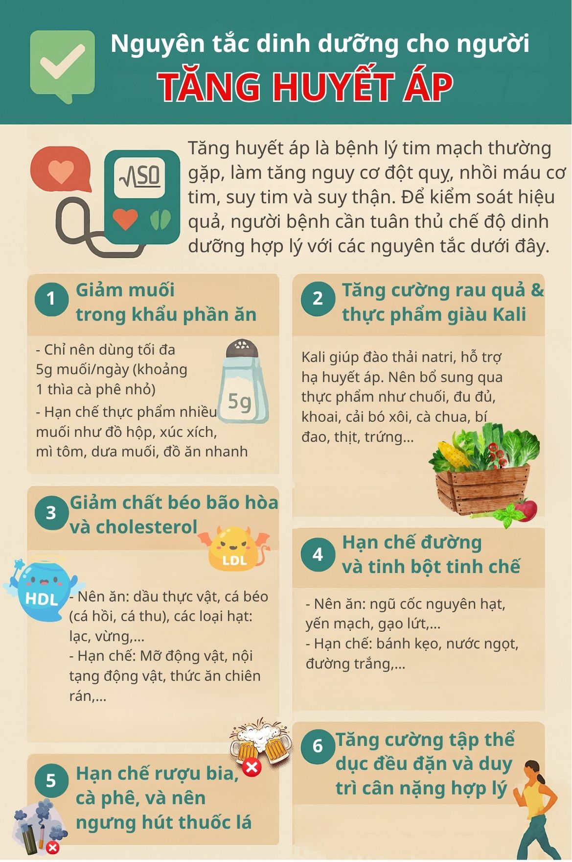 Tăng huyết áp là bệnh lý tim mạch thường gặp, làm tăng nguy cơ đột quỵ, nhồi máu cơ tim, suy tim và suy thận. Để kiểm soát hiệu quả, người bệnh cần tuân thủ chế độ dinh dưỡng hợp lý với các nguyên tắc dưới đây.