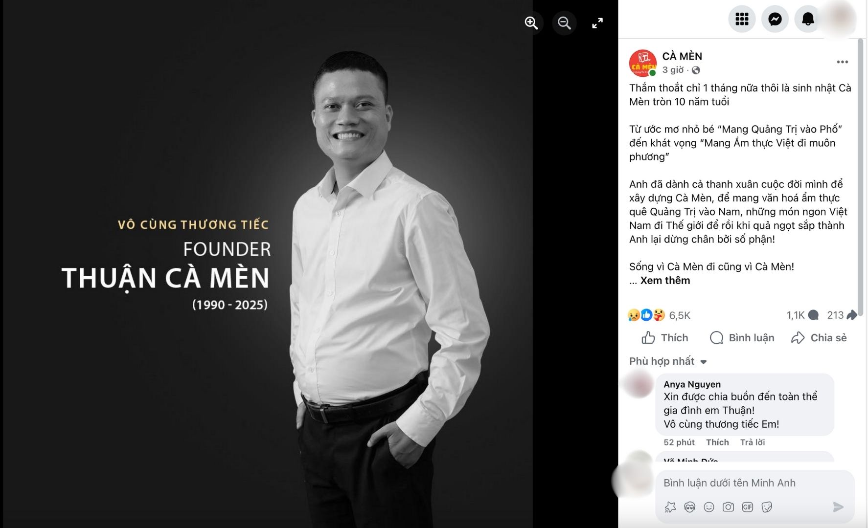 Theo đại diện Cà Mèn, sự ra đi của anh Thuận diễn ra bất ngờ, chỉ còn khoảng một tháng nữa là đến kỷ niệm 10 năm thành lập thương hiệu. “Từ ước mơ nhỏ bé “mang Quảng Trị vào phố” đến khát vọng “mang ẩm thực Việt đi muôn phương”, anh đã dành phần lớn tuổi trẻ để xây dựng và phát triển Cà Mèn. Khi những quả ngọt đang đến gần, anh lại dừng chân vì số phận”, thông báo viết.