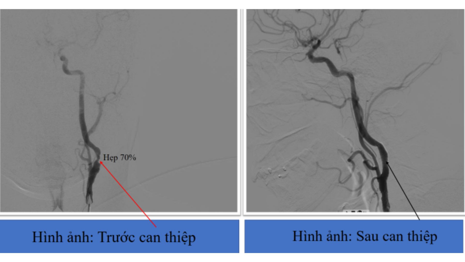 Nhận định đây là trường hợp nguy cơ cao tiến triển thành đột quỵ nhồi máu não nặng hoặc tử vong, ekip can thiệp do ThS.BS Giáp Hùng Mạnh – Trưởng khoa Thần kinh, VTLT – PHCN thực hiện kỹ thuật chụp mạch não, nong mạch bằng bóng và đặt stent động mạch cảnh trong trái dưới hướng dẫn của máy chụp mạch số hóa xóa nền (DSA). Ca can thiệp đã diễn ra thuận lợi và thành công.