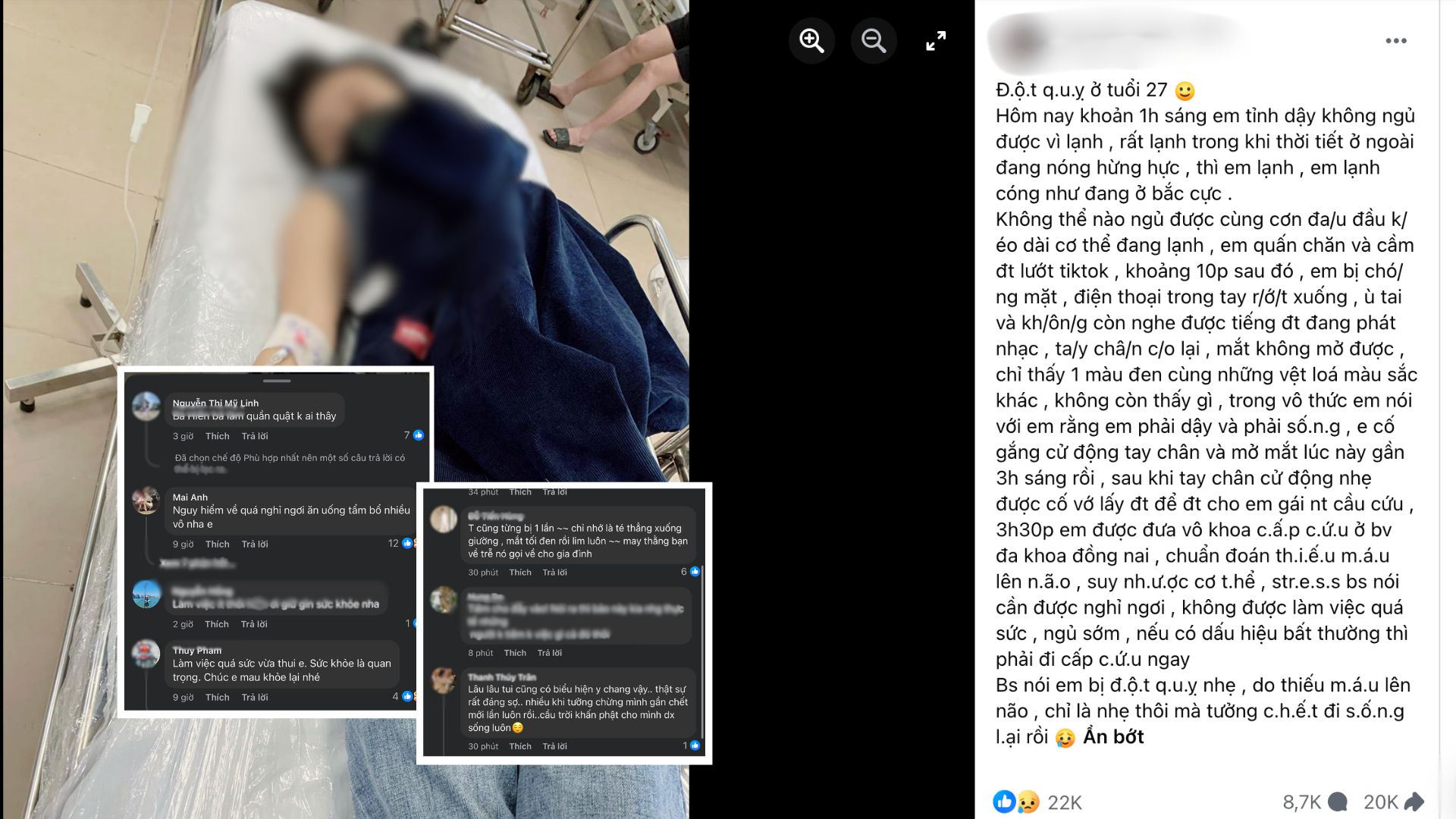 Một tài khoản mạng xã hội mới đây đã thu hút sự chú ý khi chia sẻ về trải nghiệm đột quỵ ở tuổi 27. Chủ nhân bài đăng là một phụ nữ trẻ sống tại Biên Hòa (Đồng Nai), làm công việc bán hàng online, thường xuyên thức khuya và đối mặt với áp lực vô hình.