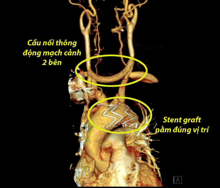 Động mạch chủ ngực sau khi được đặt Stent và hình ảnh cầu nối động mạch cảnh hai bên bằng mạch máu nhân tạo (ảnh: BV)