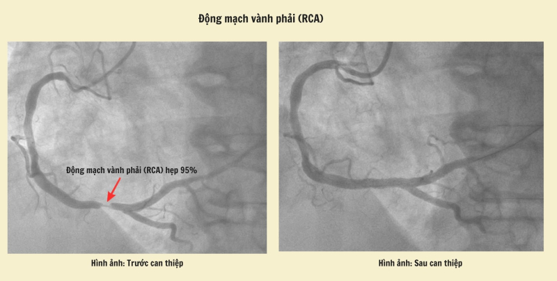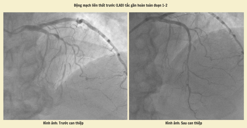 Đây là tình huống đặc biệt nguy kịch, bệnh nhân có thể ngừng tim ngay trên bàn can thiệp. Nhận định khả năng người bệnh đã tự tái thông một phần sau dùng thuốc, các bác sĩ quyết định ưu tiên đặt stent động mạch vành phải trước, giúp huyết động ổn định hơn, sau đó tiếp tục đặt stent ở động mạch liên thất trước để xử lý tổn thương hẹp rất nặng có nguy cơ ảnh hưởng đến kết quả điều trị.