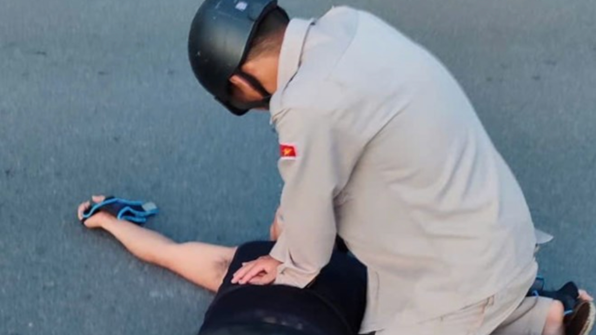 Người đi đường hỗ trợ sơ cứu cho người đàn ông đi xe đạp nghi bị đột quỵ