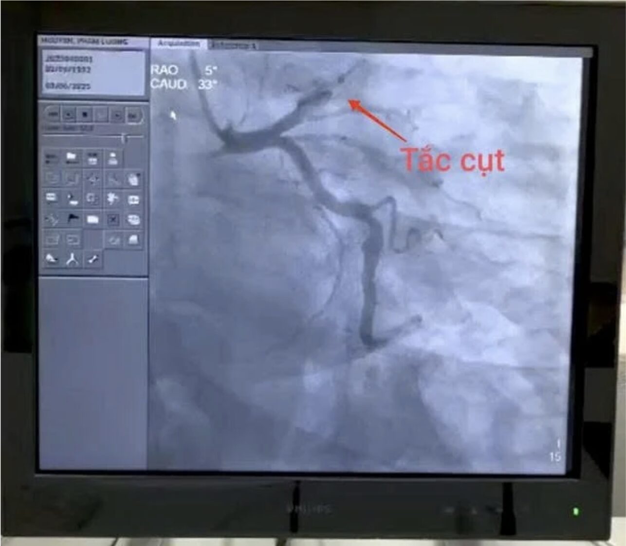 Hình ảnh nhồi máu cơ tim gây tắc nghẽn hoàn toàn từ đoạn 1, động mạch liên thất trước (LAD) (Ảnh: BVCC)