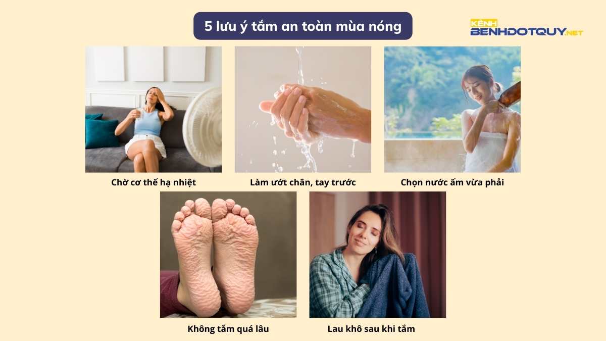 \nTắm từ từ: Không nên dội nước lạnh lên người ngay. Hãy làm ướt chân, tay trước rồi mới đến toàn thân để cơ thể thích nghi dần.