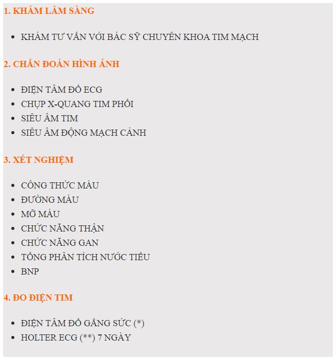 \nCụ thể, gói tầm soát Tim mạch chuyên sâu bao gồm các hạng mục sau: