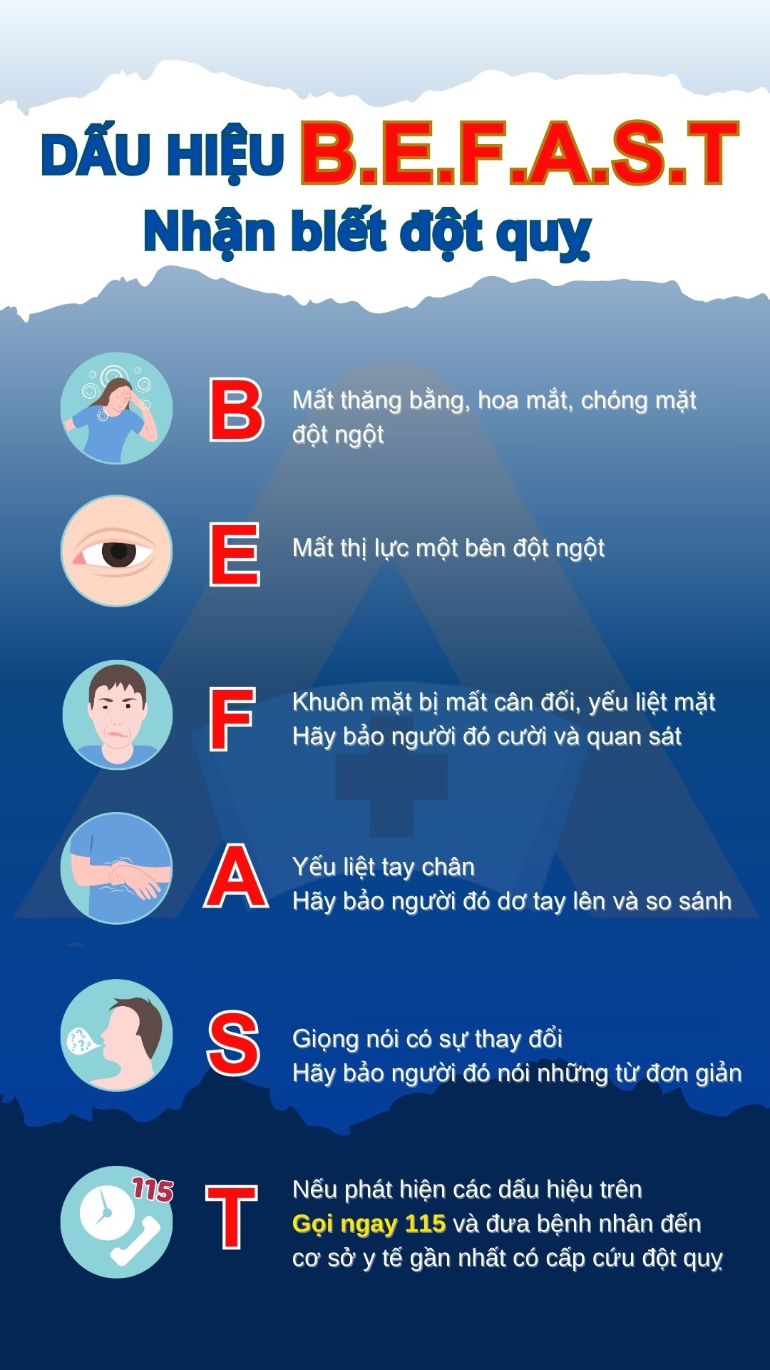 Chú ý các triệu chứng của đột quỵ theo phương pháp B.E.F.A.S.T để có thể nhận được sự trợ giúp và cấp cứu kịp thời. B.E.F.A.S.T là viết tắt của: