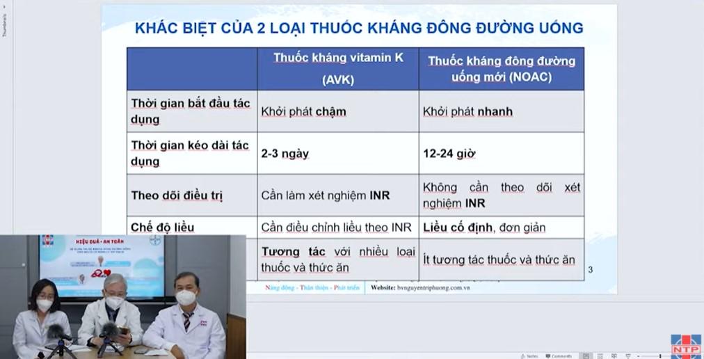 Đối với bệnh nhân ngoại trú, họ sẽ được bác sĩ kê đơn thuốc kháng đông để uống là thuốc AVK hoặc NOAC. Như vậy, thuốc kháng đông AVERKA hoặc NOAC sẽ có một số điểm quan trọng. Điểm quan trọng thứ nhất là tác dụng của thuốc: Thuốc AVK phải mất 2-3 ngày sau mới phát huy tác dụng tối đa. Thuốc NOAC chỉ cần mất 2-3 giờ là phát huy được tác dụng tối đa, như vậy thời gian khởi phát tác động của thuốc sẽ hoàn toàn khác nhau.