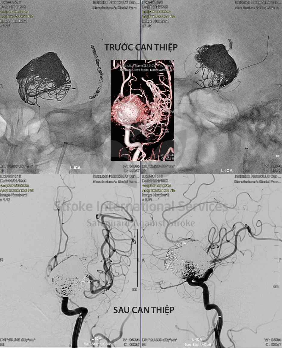 Kết quả chụp DSA tại S.I.S Cần Thơ cho thấy bà S. có túi phình khổng lồ động mạch cảnh trong trái đoạn động mạch mắt đã đặt coil một phần, kích thước 25x35mm, cổ rộng và gập góc.