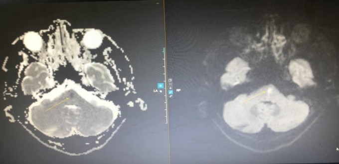 Vị trí nhồi máu não vùng thân não (trái) và sau khi được can thiệp tiêu sợi huyết gây đột quỵ qua hình ảnh MRI (phải) (Ảnh: Bệnh viện Đa khoa Tâm Anh)