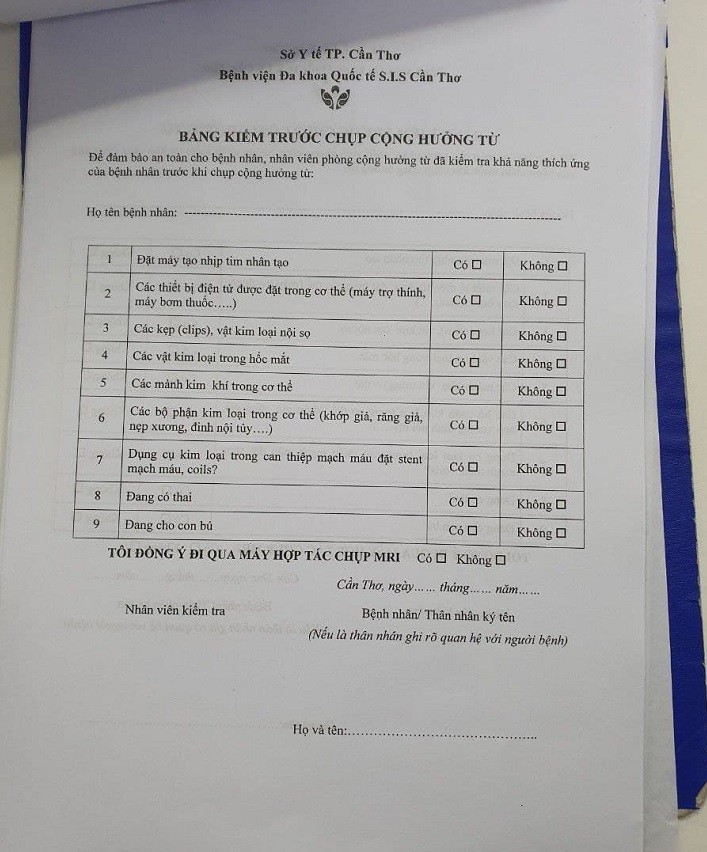 Tháng 1/2022, tôi có dịp chụp cộng hưởng từ để kiểm tra xem mạch máu não có vấn đề gì không. Tôi thực hiện việc này tại Bệnh viện Đa khoa Quốc tế S.I.S Cần Thơ, nơi có những chiếc máy MRI 3 tesla được xem là xịn sò nhất miền Tây. À, các bạn ở vùng miền khác cũng có thể tiếp cận máy MRI 3 tesla theo danh sách sau nhé: Những bệnh viện chụp MRI 3Tesla tại Việt Nam Sau khi gọi tôi vào phòng chụp MRI, nhân viên hỏi tôi khoảng chục câu về các tiền sử xem có gì ảnh hưởng đến việc chụp hay không, quan trọng là trên người, trong người không còn miếng kim loại nào.