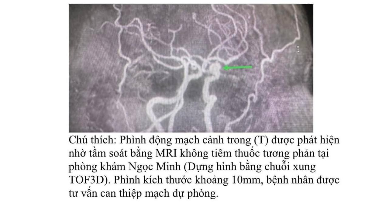 Điều này phù hợp cho việc tầm soát túi phình mà hạn chế lo ngại về việc liều tia xạ (đối với CT) hoặc phải tiêm thuốc như MRA mạch máu não trước đây. Hình minh họa một trường hợp bệnh nhân được phát hiện túi phình động mạch cảnh trong (T), đường kính 10mm tại phòng khám Ngọc Minh. Bệnh nhân được tư vấn điều trị can thiệp nội mạch.